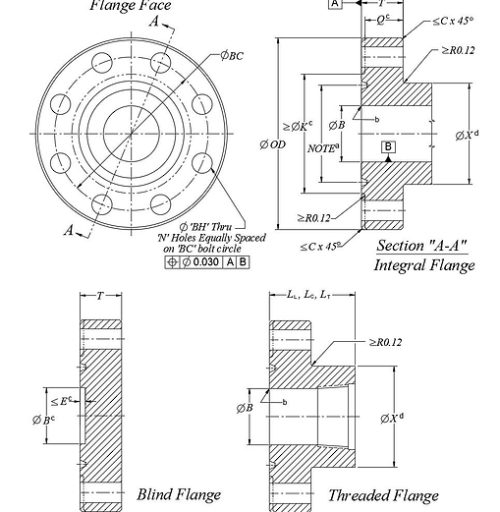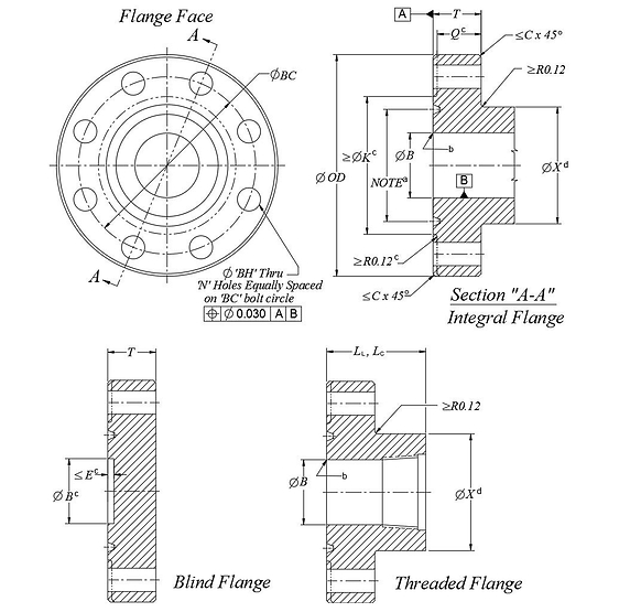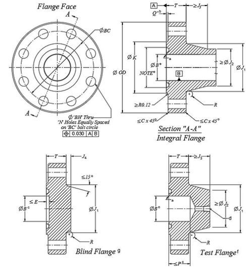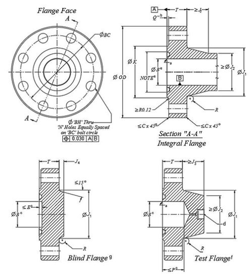 | Nominal size of Flange | Maximum Bore | Outside Diameter of Flange | Diameter of Raised Face | Total Thickness of Flange | Max Chamfer | Large Hub Diameter | Small Hub Diameter | Hub Height | Test Flange C’bore Depth |